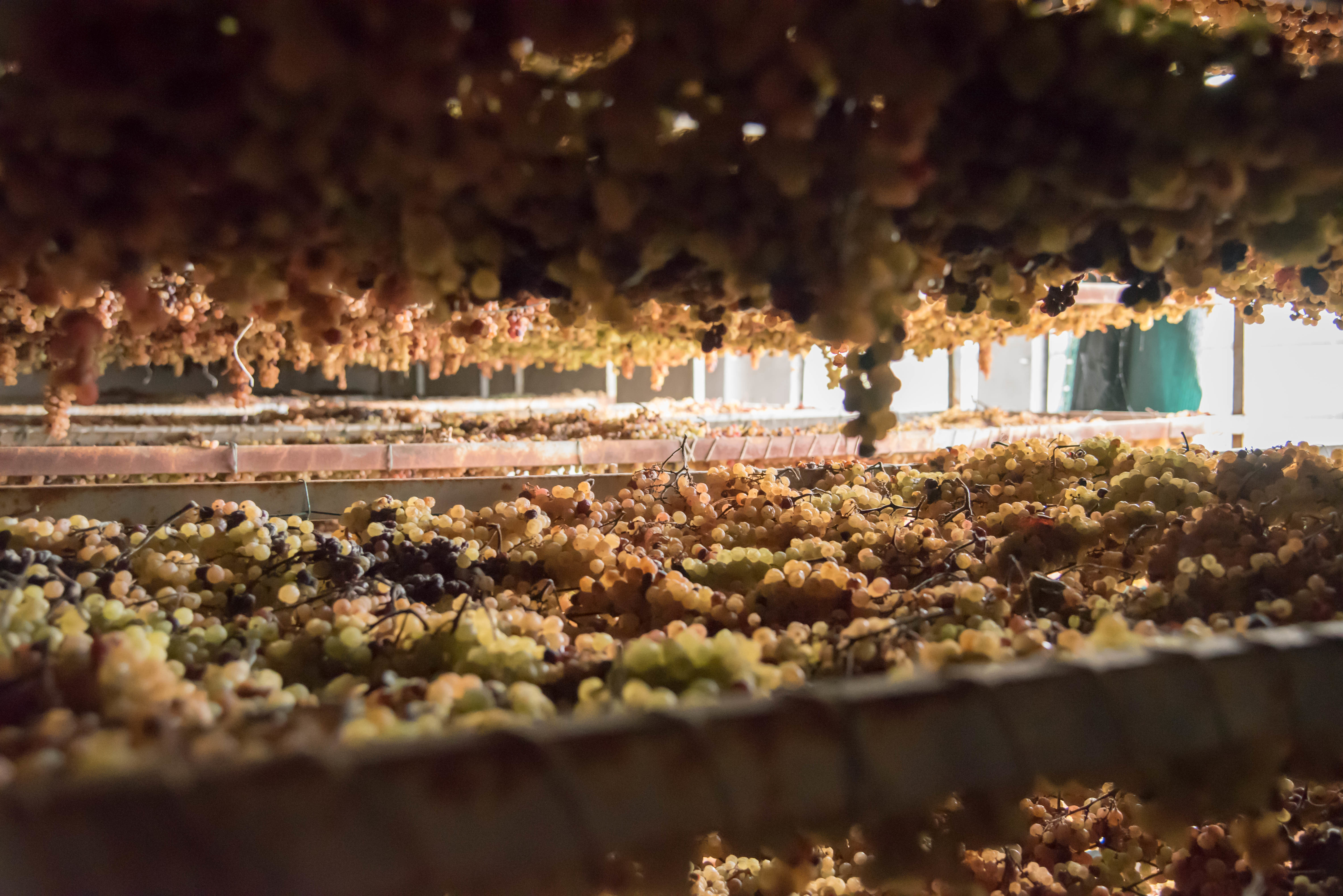 秋に同時収穫したトレビアーノ、マルヴァジア、サンコロンバーノは自然乾燥。棚の上に置かれてじっくりと甘味を凝縮させてからワイン造りへ。
