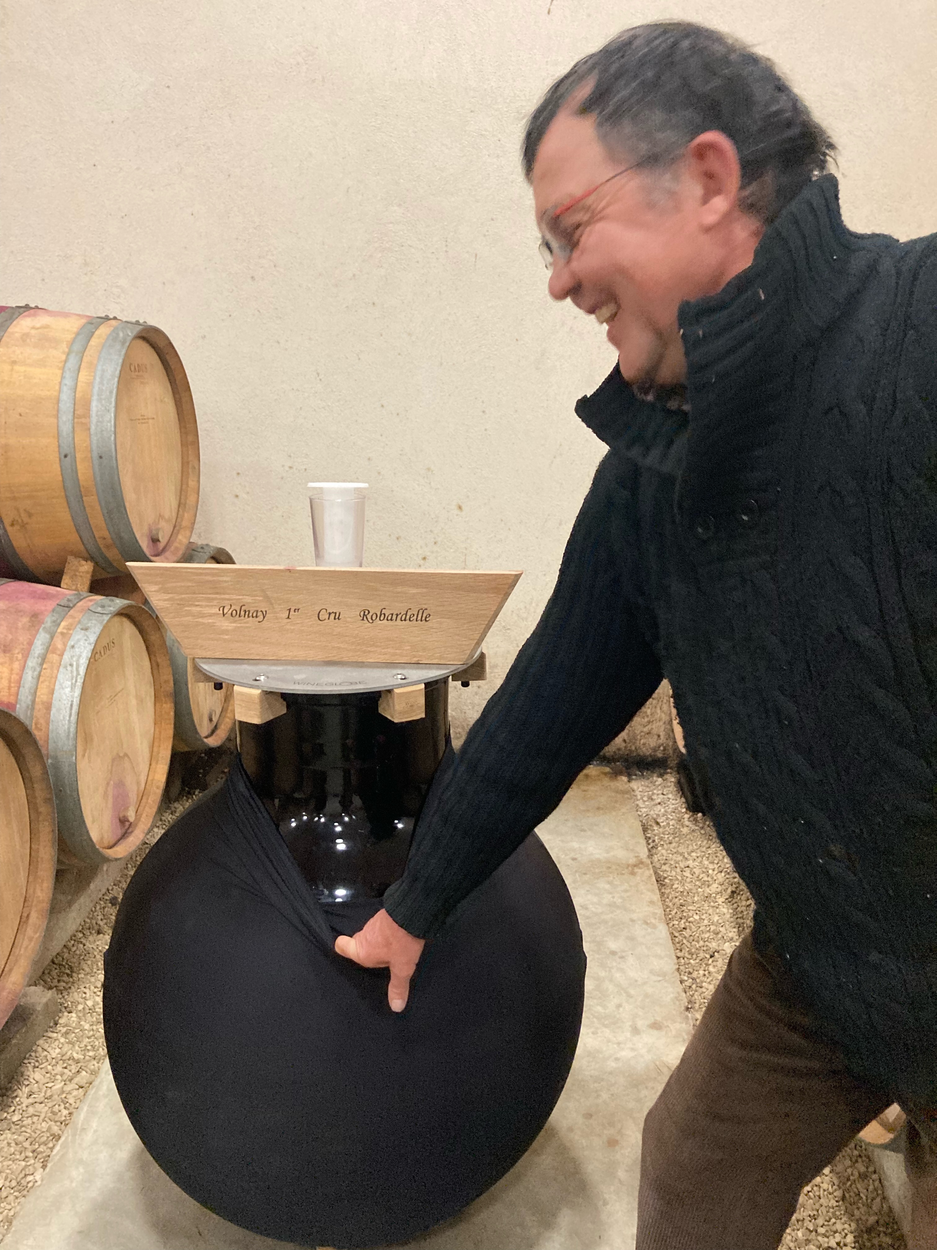 新たに導入したガラスで出来た球状の熟成容器「ワイングローブ」。So2を入れる必要が無く、ワインそのもののフレッシュさが保たれる。球体であるために澱の動きも理想的になる。