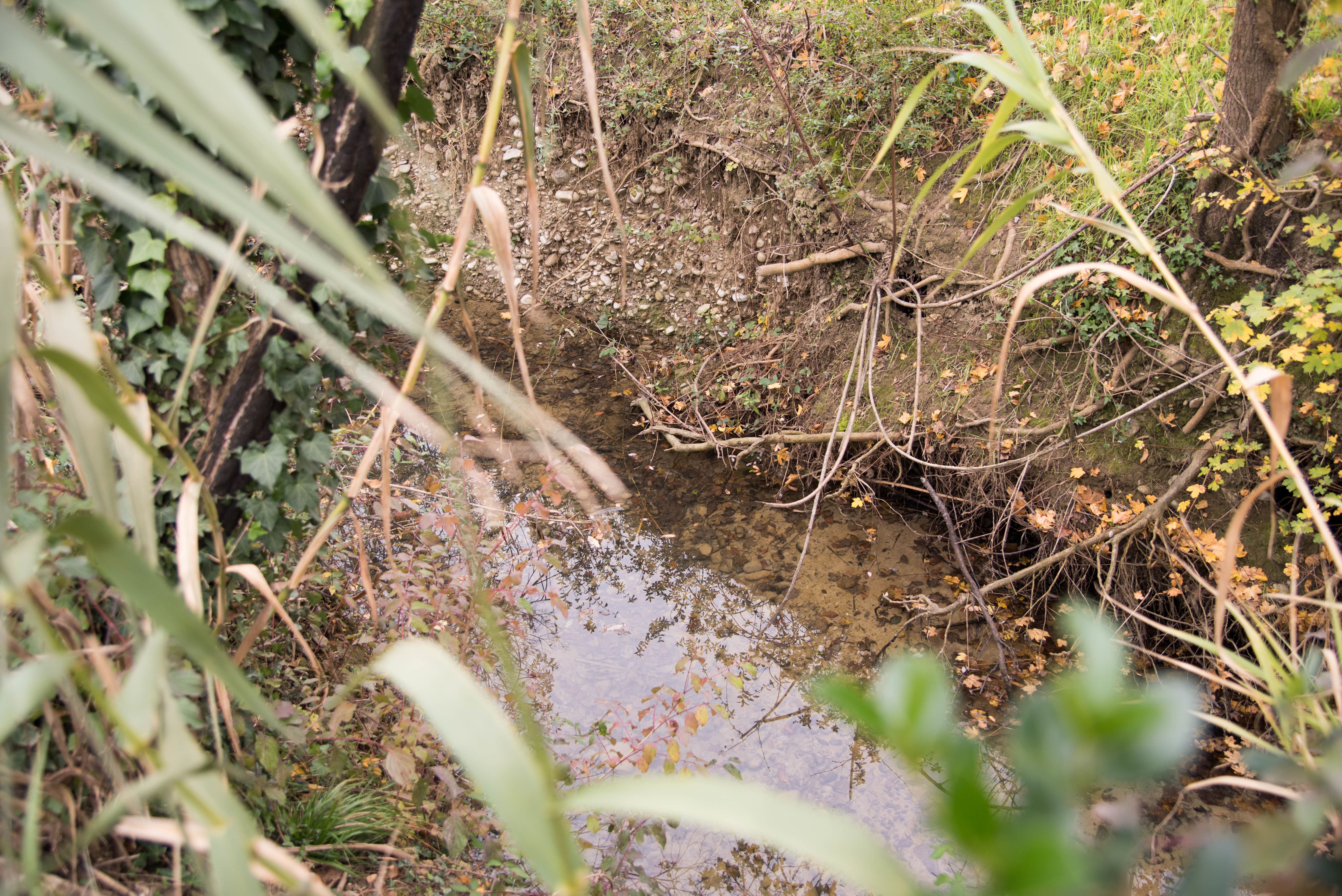 ピアッツァーノの畑のすぐ隣を流れる小川。ここでは斜面下部の小石が多くみられる粘土土壌や断層を見ることができます。